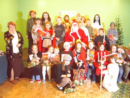 Uczestnicy Jasełek Sportowo - Rekreacyjnej Grand Prix II półrocza 2006 r., wraz z kierownik SIS Janiną Maleszewską (pierwsza z lewej z przodu) oraz kierownik Klubu "Kaktus" Małgorzatą Karpacz (pierwsza z lewej w tylnym rzędzie). Na zdjęciach poniżej - fotki z tych Jasełek i wręczania paczek przez Mikołaja.