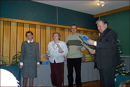 Choinka to oprócz Mikołaja (w którego rolę wcielił się kierownik GAIW, tutaj już przebrany w swoje ubranie) z paczkami - także dobry czas na podsumowanie Grand Prix II półrocza - na zdjęciu wręczanie dyplomów i nagród najlepszym uczestnikom Grand Prix II półrocza 2002 roku. Od lewej: kierownik Klubu "Kaktus" Małgorzata Karpacz, kierownik SIS Janina Maleszewska, kierownik GAIW Paweł Makarewicz i prezes SM Słoneczny Stok Włodzimierz Abramowicz